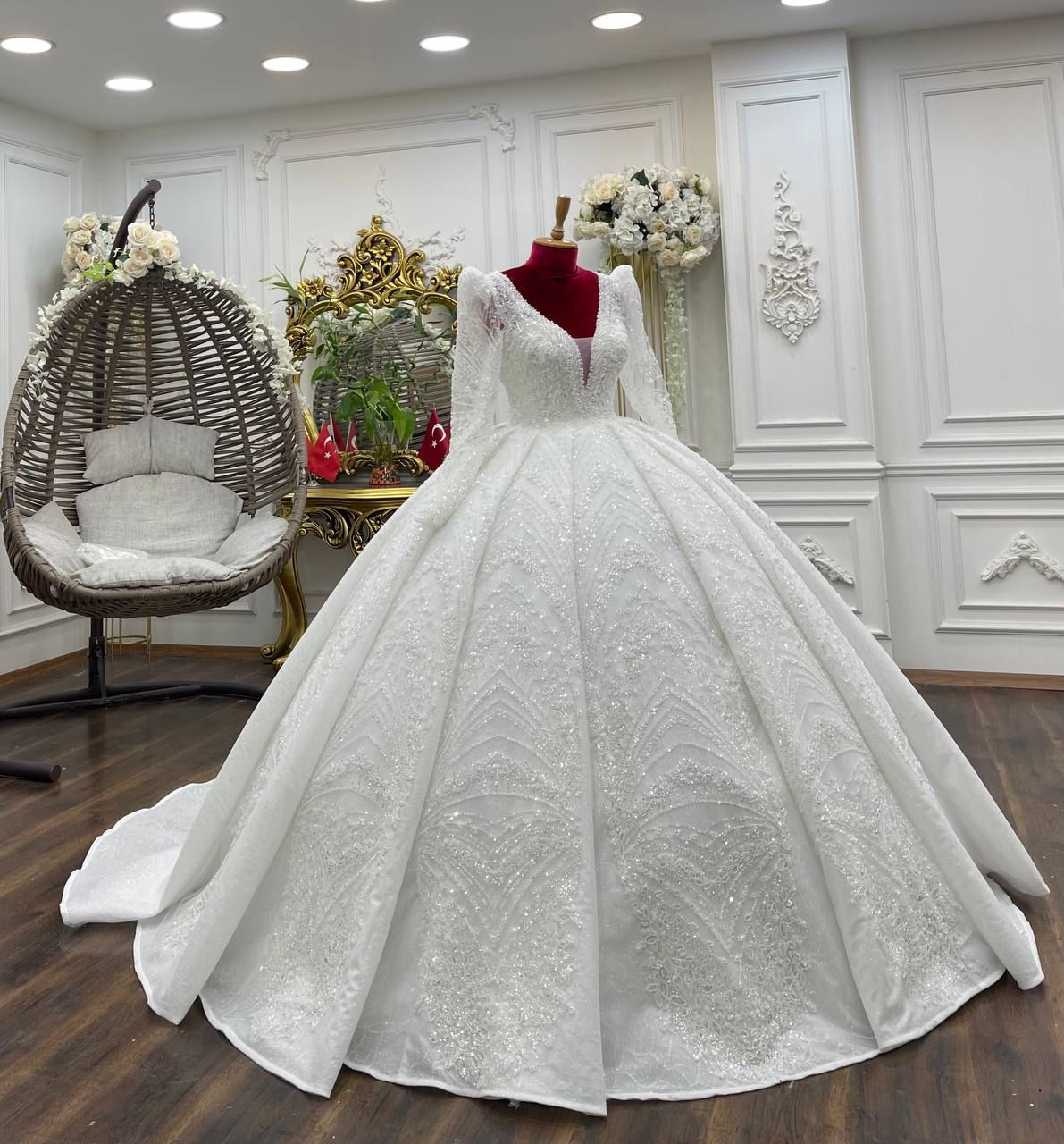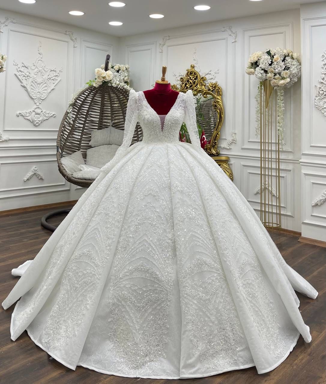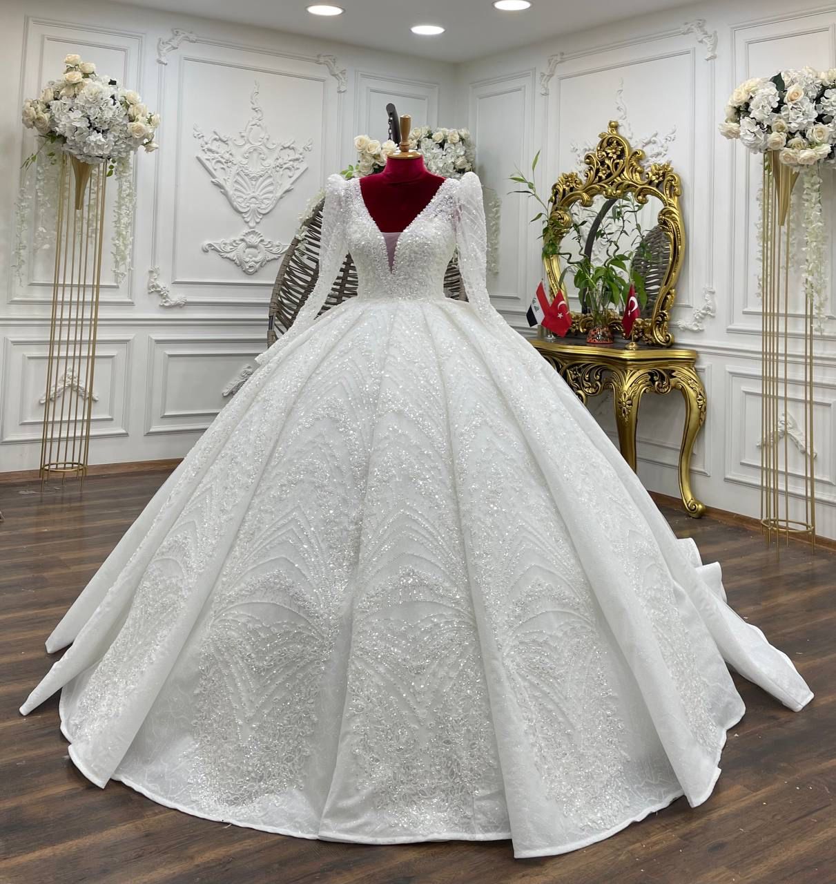 تألقي في يوم زفافك بإطلالة ملكية ساحرة مع فستان زفاف ملكي بأكمام طويلة من الدانتيل وذيل واسع مطرز الفاخر الذي يجسد الأناقة والرقي. كما يتميز الفستان بقصة الكرة التقليدية. التي تبرز جمال الجزء العلوي من الجسم وتتسع بسخاء من الخصر. لتخلق تنورة واسعة ومنفوشة تضفي عليكِ مظهرًا أميريًا.