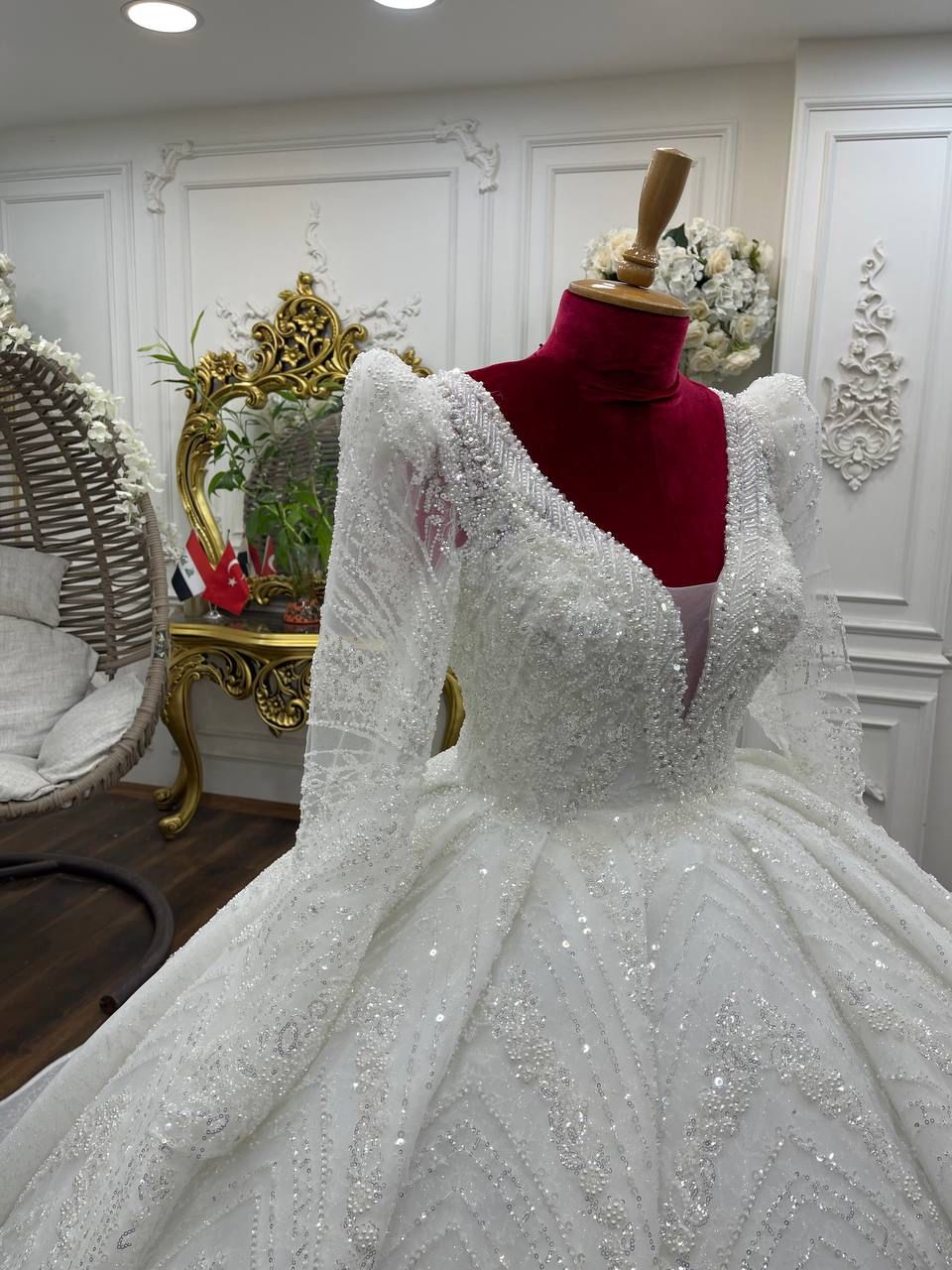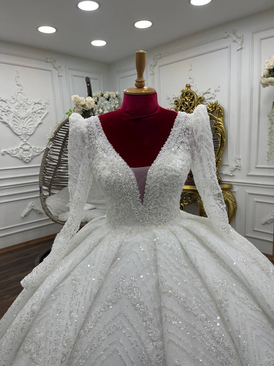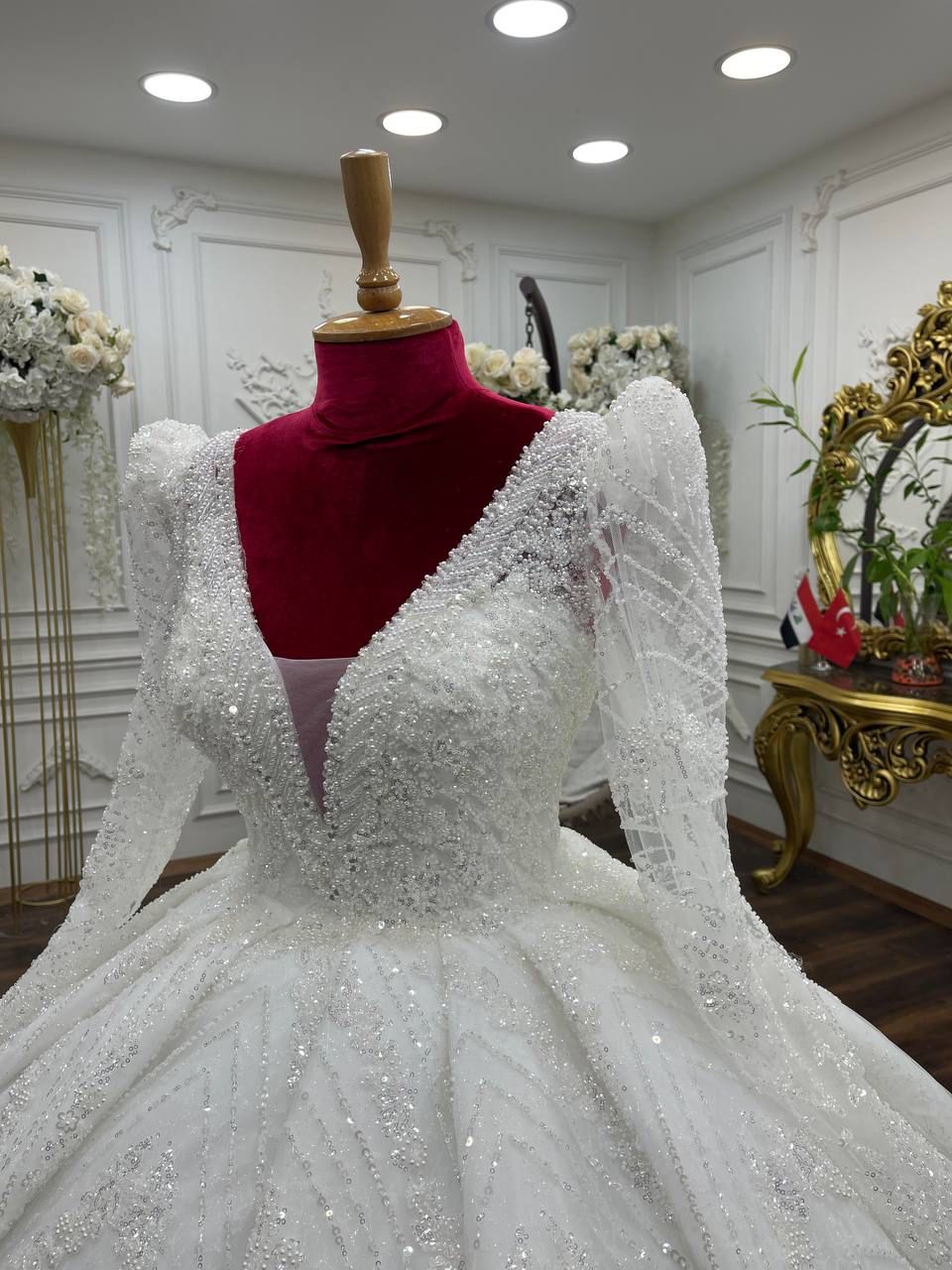 كما يأتي فستان زفاف ملكي بأكمام طويلة من الدانتيل وذيل واسع مطرز بظهر مغلق على طول الظهر. مما يضيف لمسة كلاسيكية وأنيقة للتصميم. هذا الفستان هو الخيار المثالي للعروس التي تحلم بإطلالة ملكية فخمة تجمع بين الأناقة التقليدية واللمسة العصرية الراقية.
